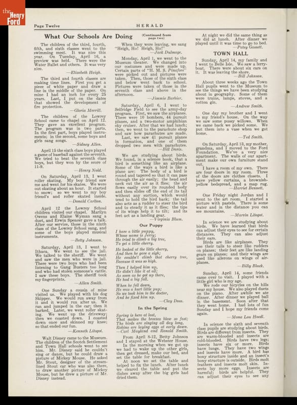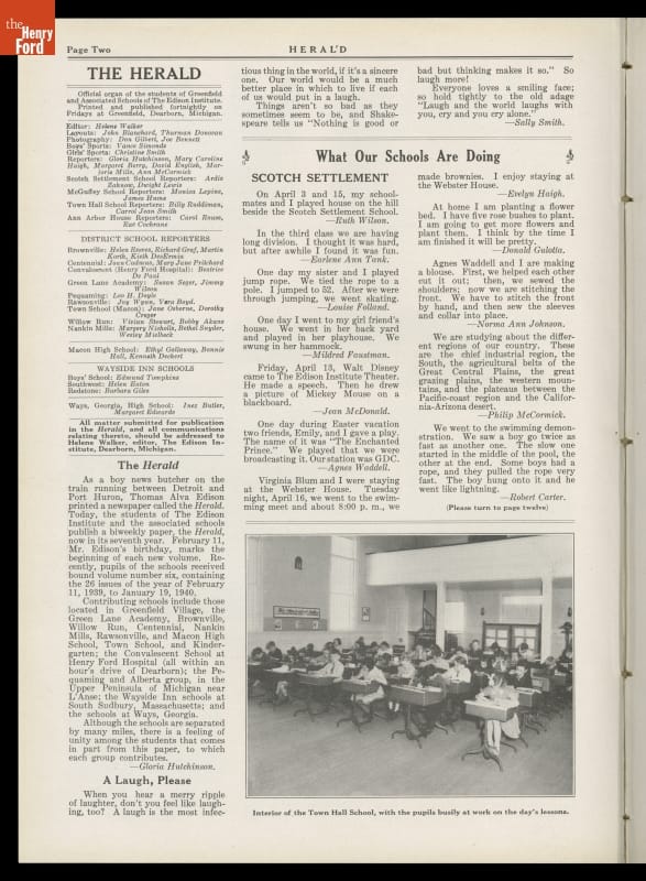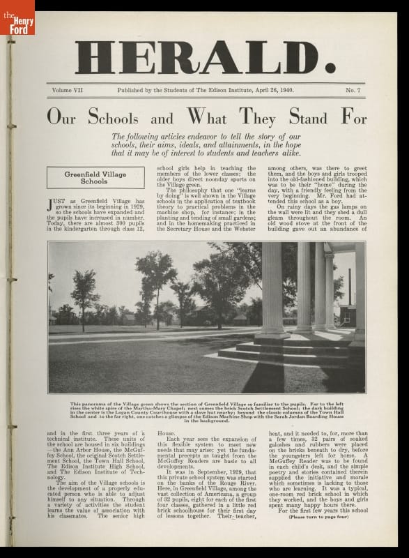 The students of the Greenfield Village and Associated Schools of the Edison Institute began publishing the Herald in 1934. They took the name from a weekly newspaper printed and sold by Thomas Alva Edison when he worked for the Grand Trunk Railroad in 1862-63. The students' version included articles on academic, social, and recreational activities. The publication continued until 1952.