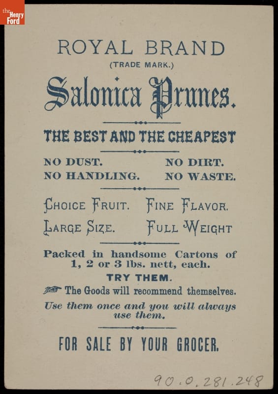 Trade Card for Royal Brand Salonica Prunes, 1888