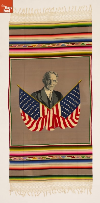 Henry Ford's corporate family was generous when it came to acknowledging their leader's enterprising and innovative strides forward. This large professionally woven tapestry was a gift to Henry Ford on his 78th birthday, presented by the manager of Ford Motor Company Mexico City.