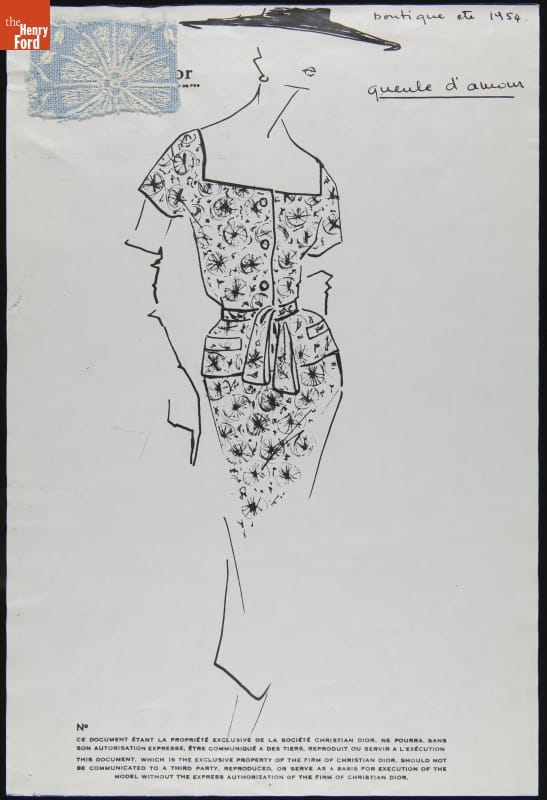 Christian Dior Fashion Design Drawing with Fabric Swatch, "Queule d'Amour," 1954