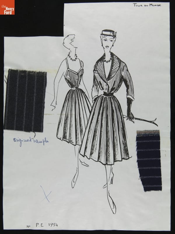 Dior Fashion Drawing with Fabric Swatches, "Tour de Monde," 1953-1954