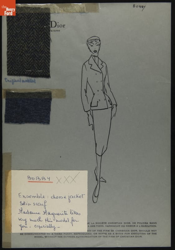 Dior Fashion Drawing with Fabric Swatches, "Bobby," 1953-1954