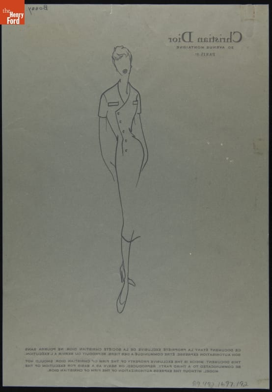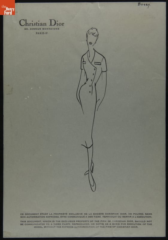Fashion houses provided sketches to clients interested in purchasing garments from the designer's line of couture clothing. These sketches contained an image of a gown, dress or other apparel, illustrating the designer's stylistic vision. Fabric samples were usually included. Clients could then decide which design to purchase and suggest personal changes. This sketch was sent to Elizabeth Parke Firestone, wife of tire magnate Harvey S. Firestone, Jr.