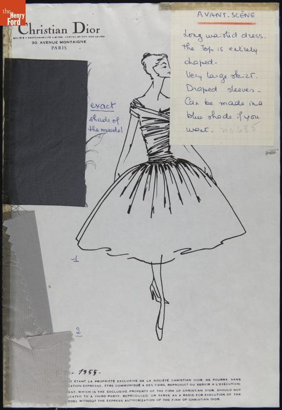 Dior Fashion Drawing with Fabric Swatches, "Avant Scene," 1955
