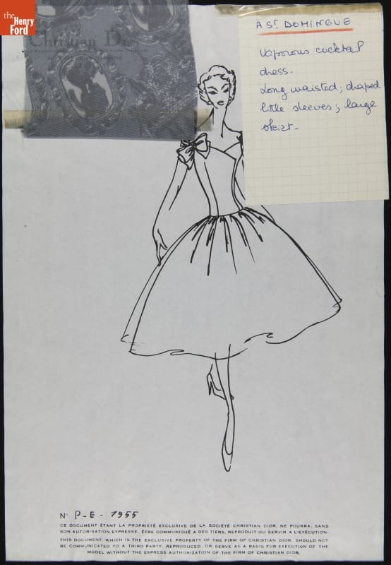 Fashion houses provided sketches to clients interested in purchasing garments from the designer's line of couture clothing. These sketches contained an image of a gown, dress or other apparel, illustrating the designer's stylistic vision. Fabric samples were usually included. Clients could then decide which design to purchase and suggest personal changes. This sketch was sent to Elizabeth Parke Firestone, wife of tire magnate Harvey S. Firestone, Jr.