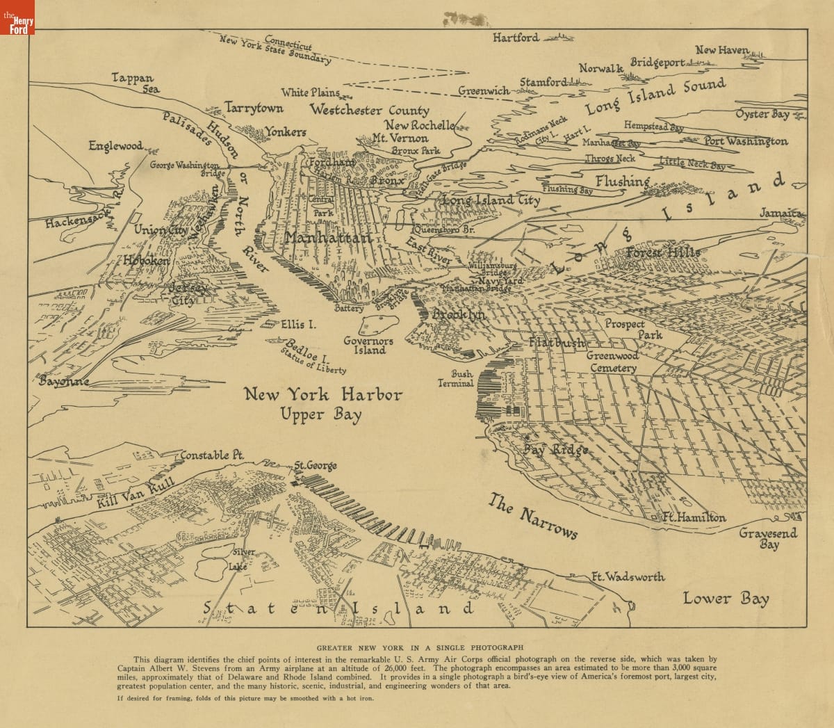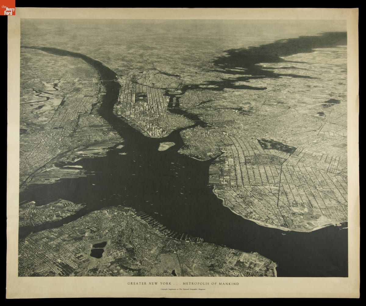 Aerial photography offered a fresh perspective on familiar places. National Geographic published this photo of the greater New York City area in 1933. Manhattan is at center-left, framed by the Hudson River to the west and the East River to the east. New Jersey is at left, Brooklyn and Long Island are at right, and Staten Island sits at the bottom.