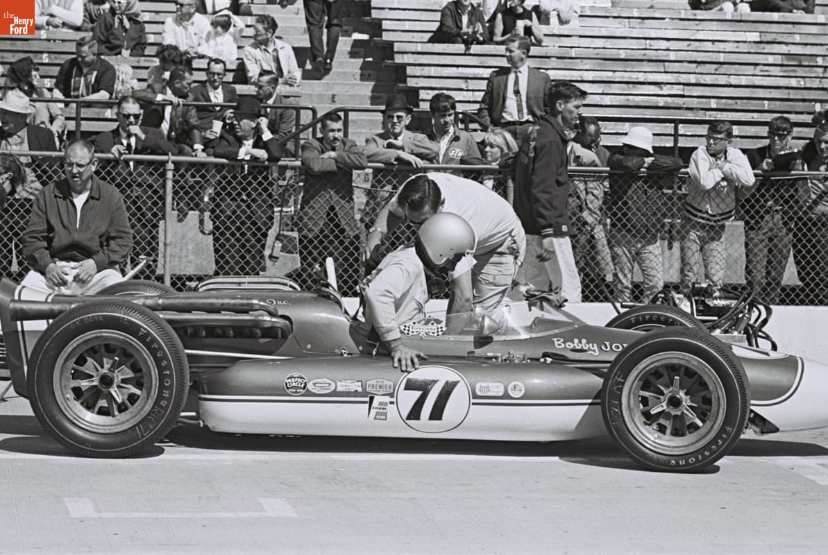 Dave Friedman captured and preserved auto racing history through his photography. His work -- and his collection of works by other photographers -- documents key races, cars, and drivers. This shot shows events surrounding the 1967 Indianapolis 500. Parnelli Jones dominated with the turbine-powered #40 car, but a bearing failed him with four laps to go. A.J. Foyt won with the #14 Coyote-Ford.