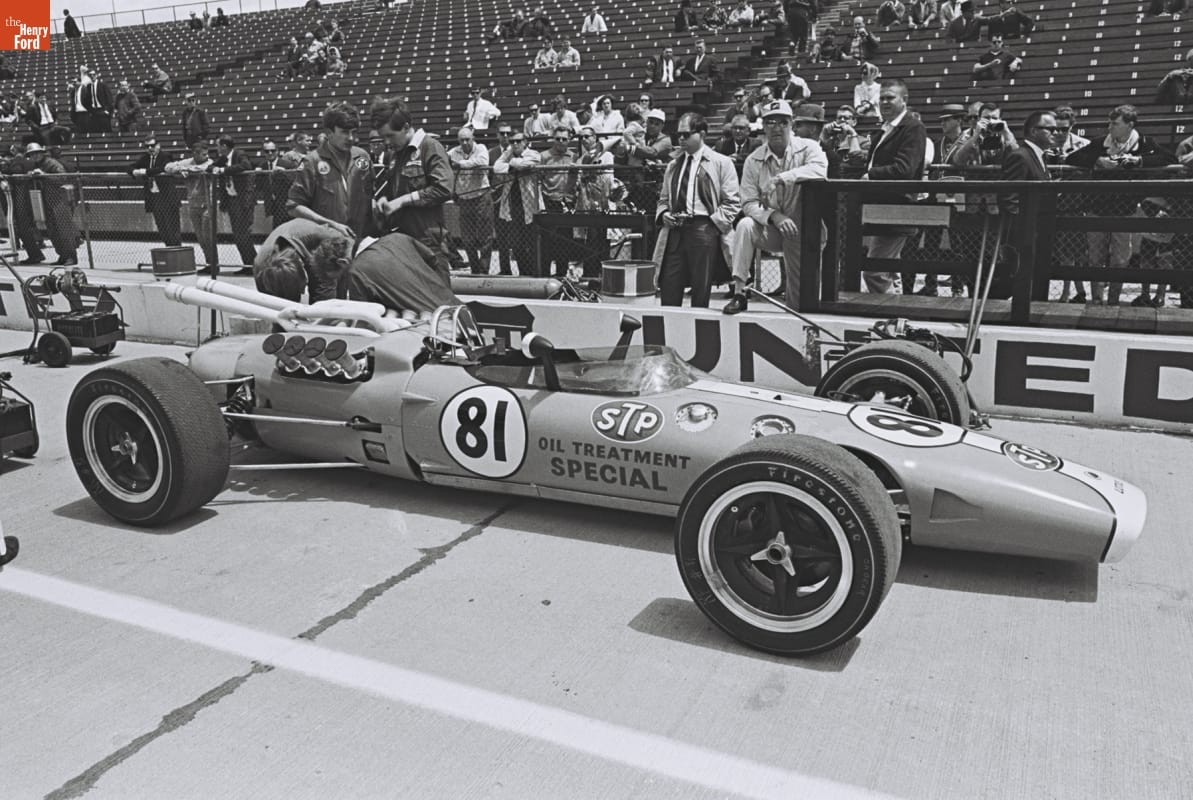 Dave Friedman captured and preserved auto racing history through his photography. His work -- and his collection of works by other photographers -- documents key races, cars, and drivers. This shot shows events surrounding the 1967 Indianapolis 500. Parnelli Jones dominated with the turbine-powered #40 car, but a bearing failed him with four laps to go. A.J. Foyt won with the #14 Coyote-Ford.