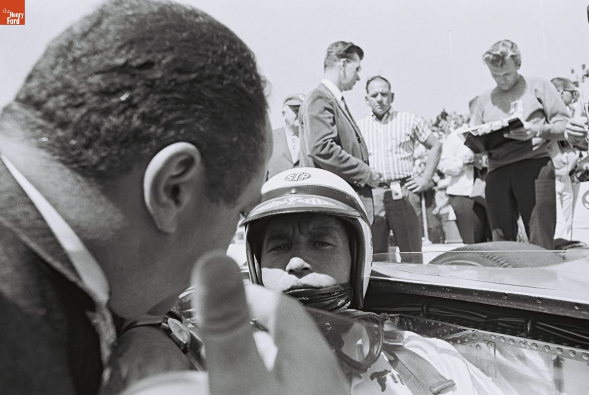 Parnelli Jones drove the #40 car for Andy Granatelli and his STP team at the 1967 Indianapolis 500. The unusual racer was powered by a turbine engine that was mounted on one side while Jones sat on the other. Jones and the turbine car dominated the race until a gearbox bearing failed only four laps from the finish.