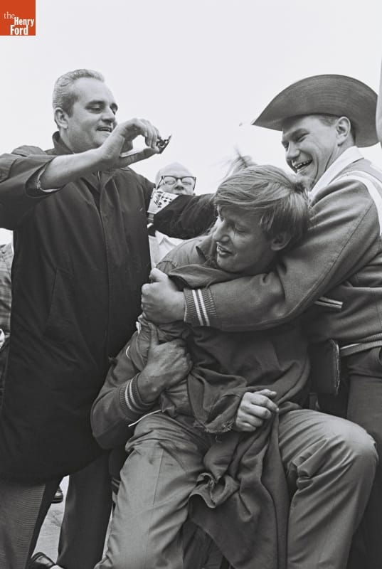 Dave Friedman captured and preserved auto racing history through his photography. His work -- and his collection of works by other photographers -- documents key races, cars, and drivers. This shot shows events surrounding the 1967 Indianapolis 500. Parnelli Jones dominated with the turbine-powered #40 car, but a bearing failed him with four laps to go. A.J. Foyt won with the #14 Coyote-Ford.