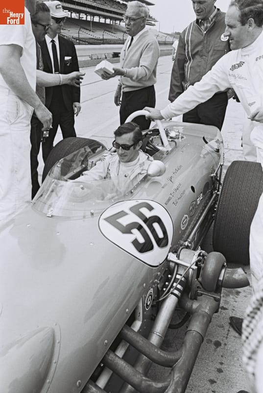 Dave Friedman captured and preserved auto racing history. His photography -- and his collection of works by other photographers -- documents key races, cars, drivers, and teams. This photo caught Jackie Stewart trying out the cockpit in Jim Hurtubise's #56 car before the 1967 Indianapolis 500. Hurtubise did not qualify for the race, but Stewart finished 18th in his own #24 car.