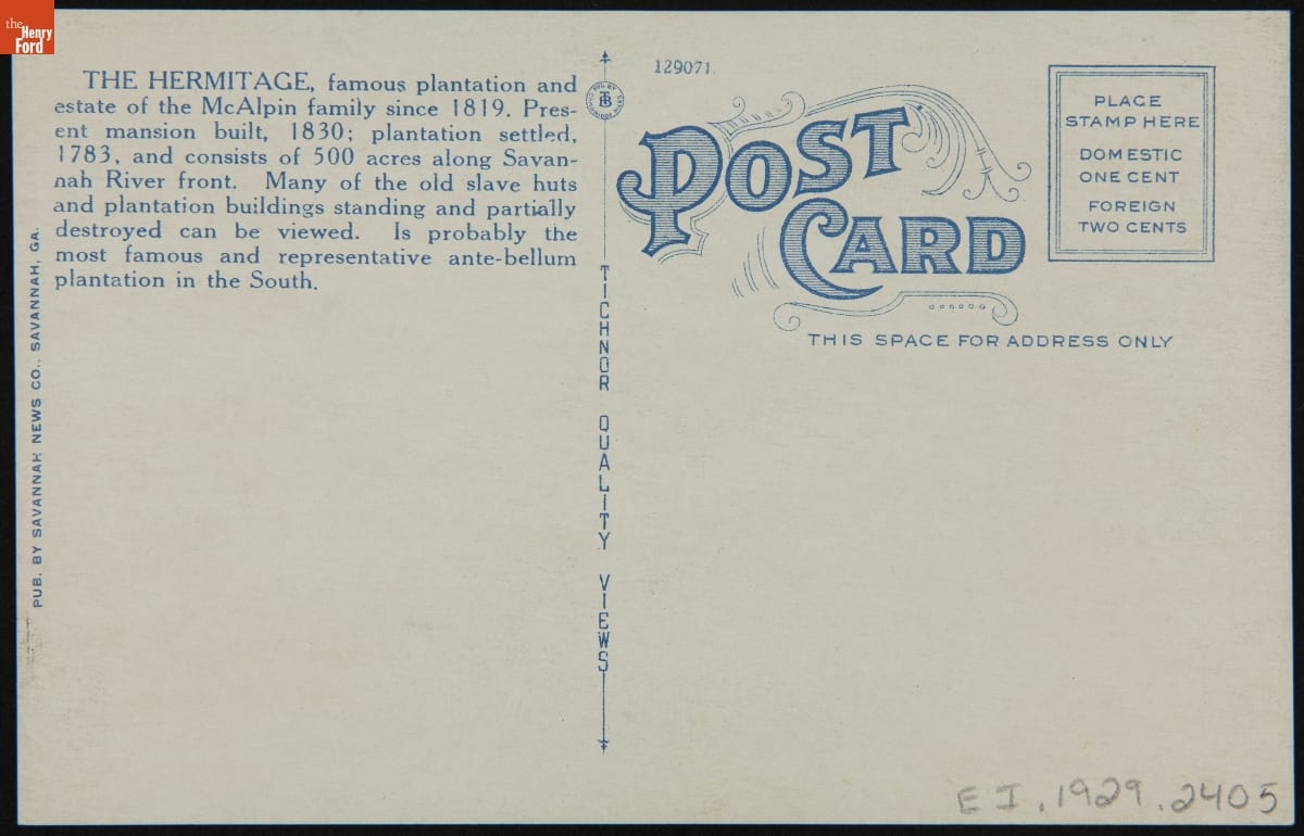 Hundreds of enslaved people worked on the Hermitage Plantation near Savannah, Georgia, before the Civil War. They cultivated rice, raised livestock, made bricks, and operated a sawmill and foundry. After the war, depictions of the "old slave huts" and the now-freed people who lived in them appealed to tourists seeking the last vestiges of the "Old South" and intent on romanticizing times of enslavement.