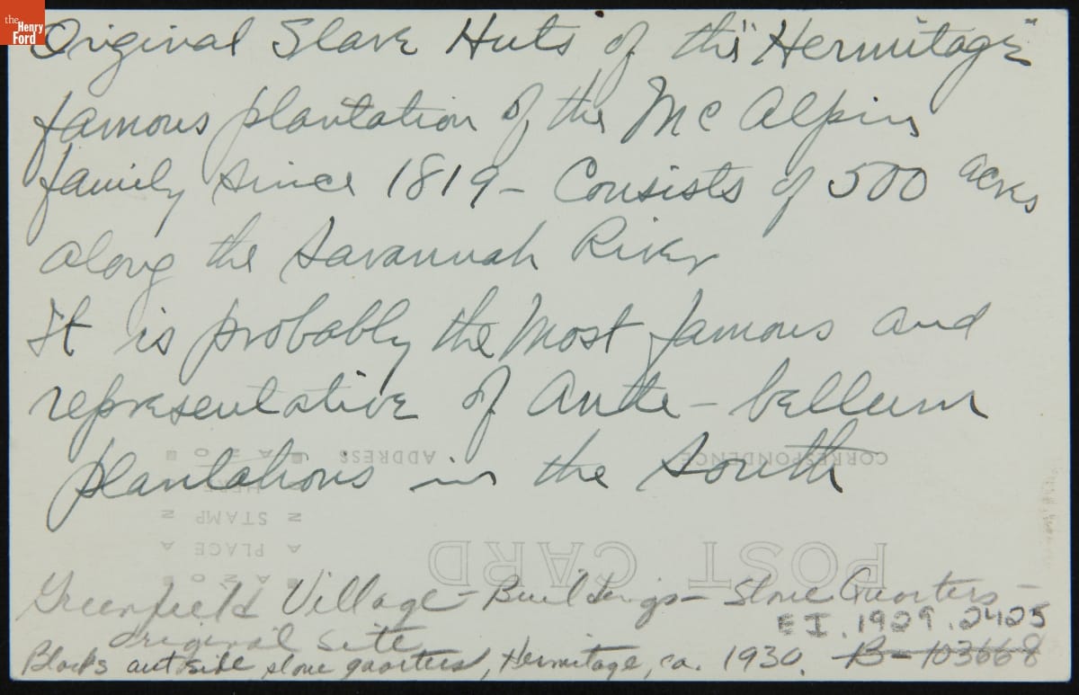 Hundreds of enslaved people worked on the Hermitage Plantation near Savannah, Georgia, before the Civil War. They cultivated rice, raised livestock, made bricks, and operated a sawmill and foundry. After the war, depictions of the "old slave huts" and the now-freed people who lived in them appealed to tourists seeking the last vestiges of the "Old South" and intent on romanticizing times of enslavement.