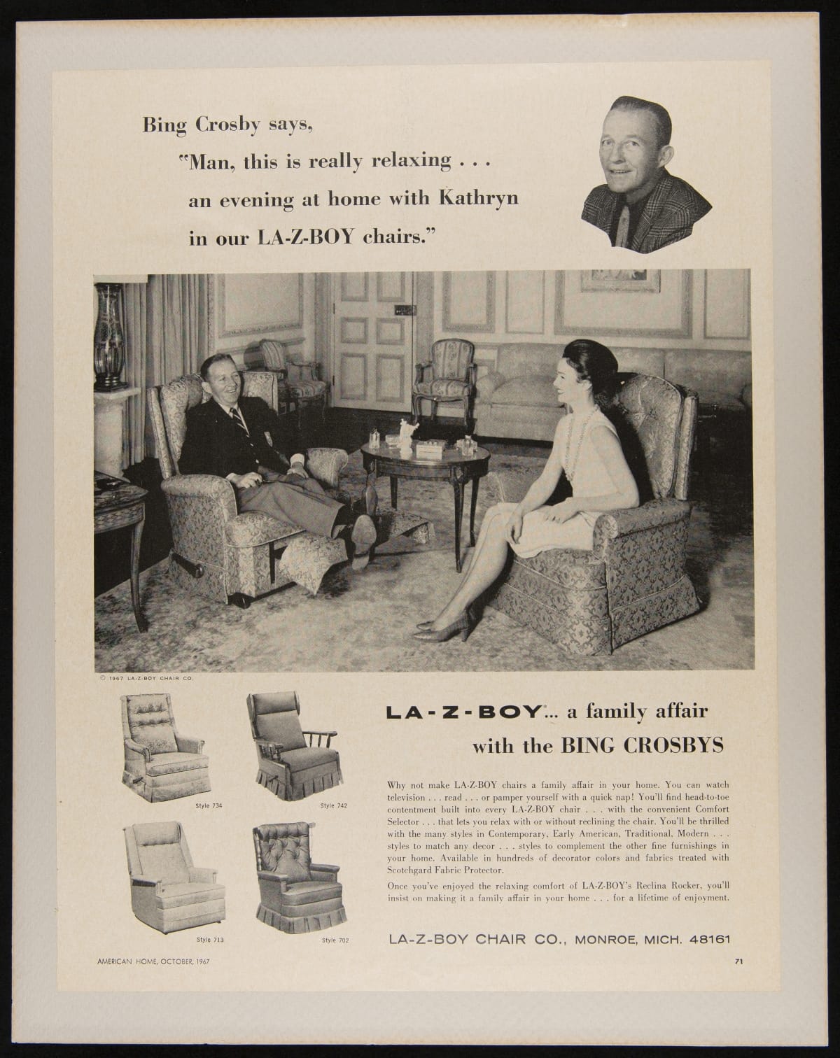 La-Z-Boy Advertisement in American Home Magazine, "A Family Affair with the Bing Crosbys," October 1967