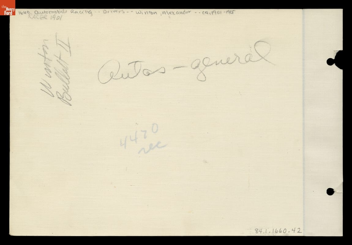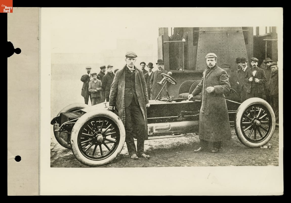Automotive industry pioneer Alexander Winton (right foreground) promoted his Winton Motor Carriage Company with a series of sleek race cars he named "Bullet." The 1903 "Bullet 2" was powered by two four-cylinder engines bolted together -- an early eight-cylinder engine -- and was driven at more than 80 miles per hour by racer Barney Oldfield at Daytona Beach in January 1904.