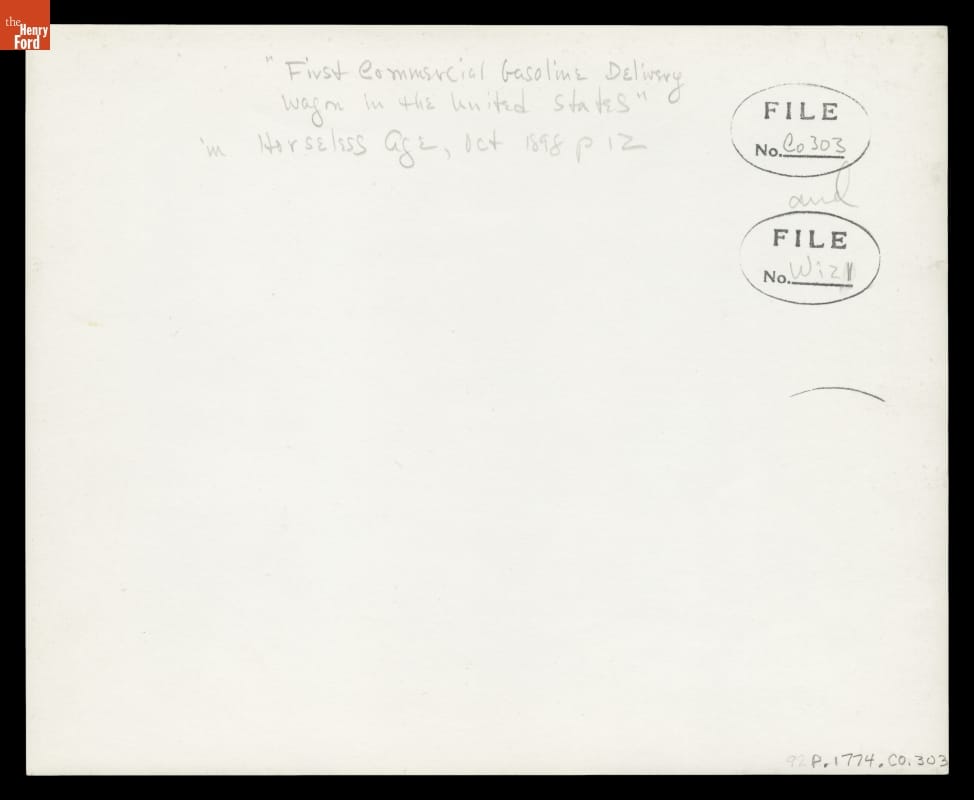 First commissioned gasoline delivery wagon in the United States. Horseless Carriage, October 1898 P. 12
