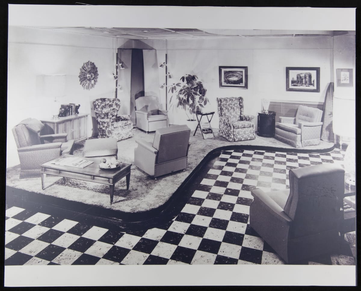 La-Z-Boy furniture showrooms featured artful displays that presented a variety of styles and fabrics available for reclining chairs--the core of the business. By the mid-1950s, showrooms focused on La-Z-Boy's place within the household. Groupings of furniture helped customers envision how a new recliner might fit in their homes.