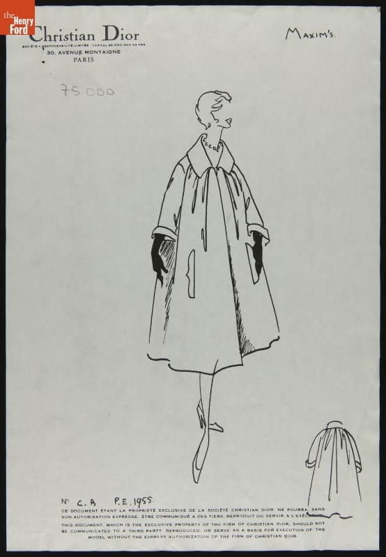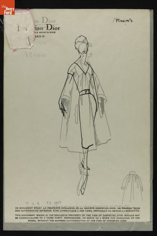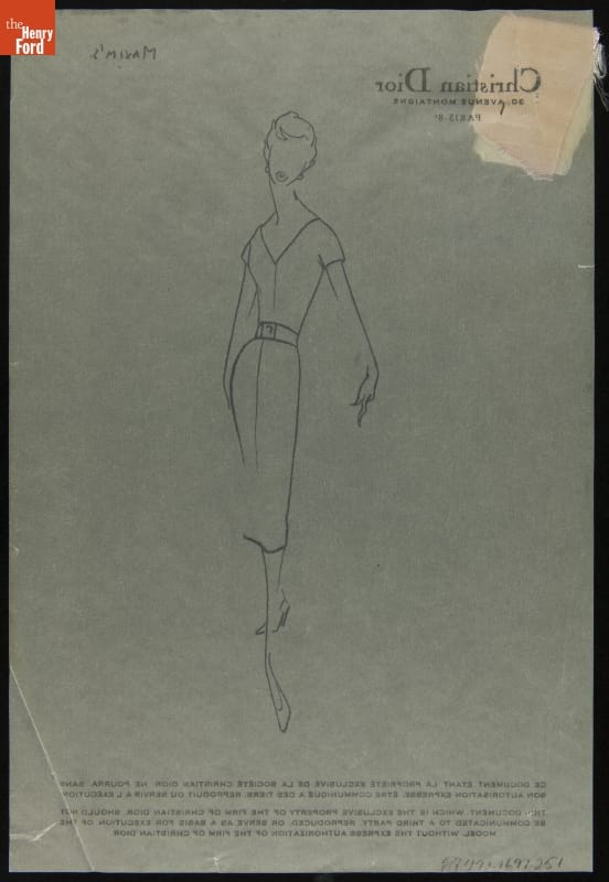 Fashion houses provided sketches to clients interested in purchasing garments from the designer's line of couture clothing. These sketches contained an image of a gown, dress or other apparel, illustrating the designer's stylistic vision. Fabric samples were usually included. Clients could then decide which design to purchase and suggest personal changes. This sketch was sent to Elizabeth Parke Firestone, wife of tire magnate Harvey S. Firestone, Jr.