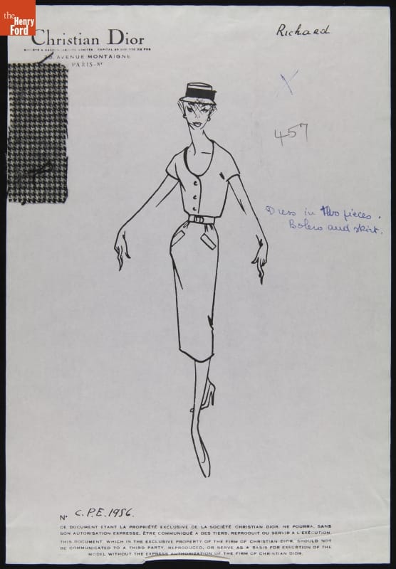 Fashion houses provided sketches to clients interested in purchasing garments from the designer's line of couture clothing. These sketches contained an image of a gown, dress or other apparel, illustrating the designer's stylistic vision. Fabric samples were usually included. Clients could then decide which design to purchase and suggest personal changes. This sketch was sent to Elizabeth Parke Firestone, wife of tire magnate Harvey S. Firestone, Jr.