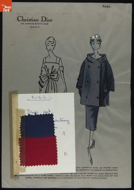 Dior Fashion Drawing with Fabric Swatches, "Rubis," 1957
