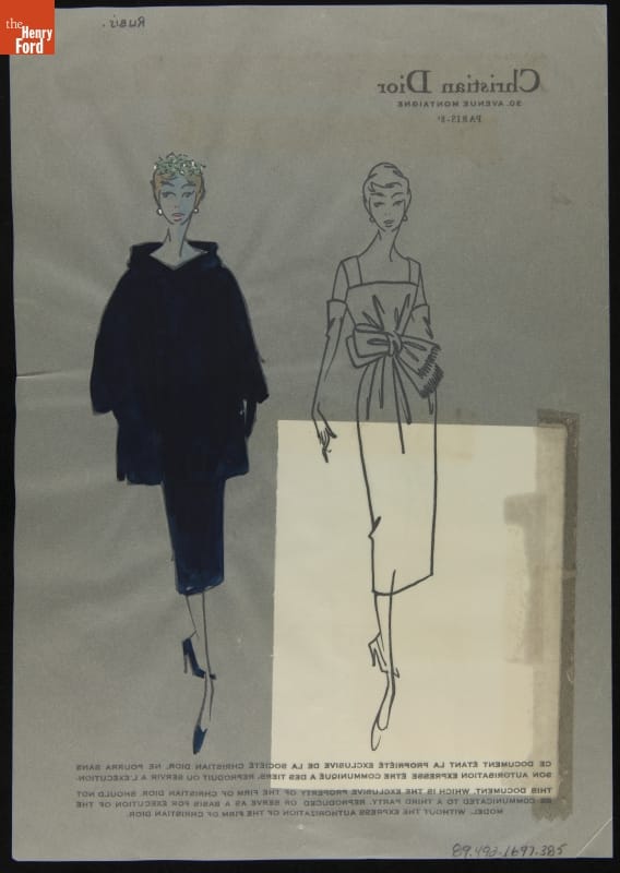 Fashion houses provided sketches to clients interested in purchasing garments from the designer's line of couture clothing. These sketches contained an image of a gown, dress or other apparel, illustrating the designer's stylistic vision. Fabric samples were usually included. Clients could then decide which design to purchase and suggest personal changes. This sketch was sent to Elizabeth Parke Firestone, wife of tire magnate Harvey S. Firestone, Jr.