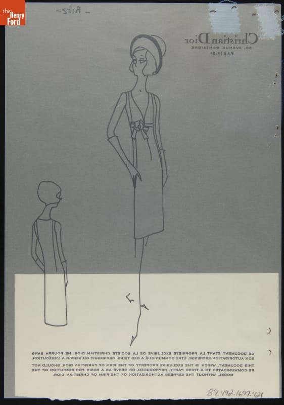 Fashion houses provided sketches to clients interested in purchasing garments from the designer's line of couture clothing. These sketches contained an image of a gown, dress or other apparel, illustrating the designer's stylistic vision. Fabric samples were usually included. Clients could then decide which design to purchase and suggest personal changes. This sketch was sent to Elizabeth Parke Firestone, wife of tire magnate Harvey S. Firestone, Jr.