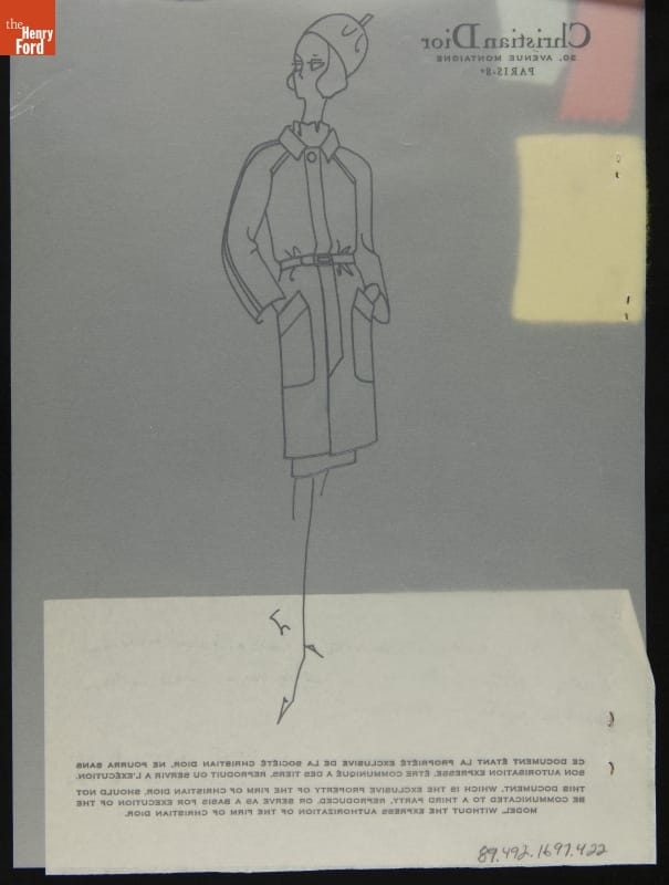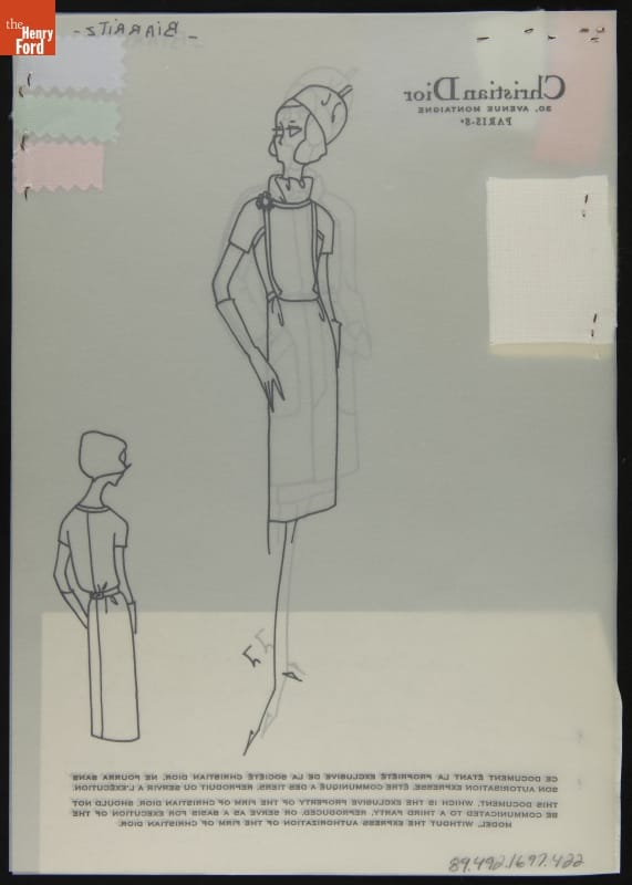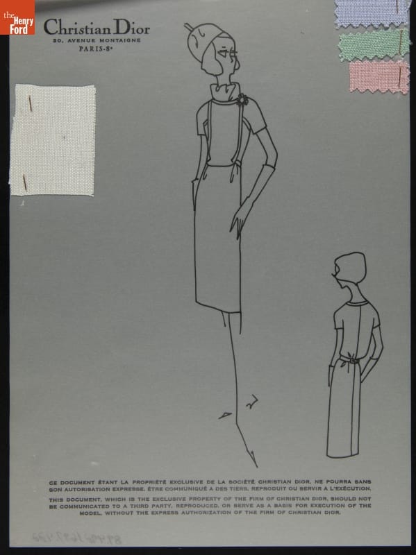 Fashion houses provided sketches to clients interested in purchasing garments from the designer's line of couture clothing. These sketches contained an image of a gown, dress or other apparel, illustrating the designer's stylistic vision. Fabric samples were usually included. Clients could then decide which design to purchase and suggest personal changes. This sketch was sent to Elizabeth Parke Firestone, wife of tire magnate Harvey S. Firestone, Jr.