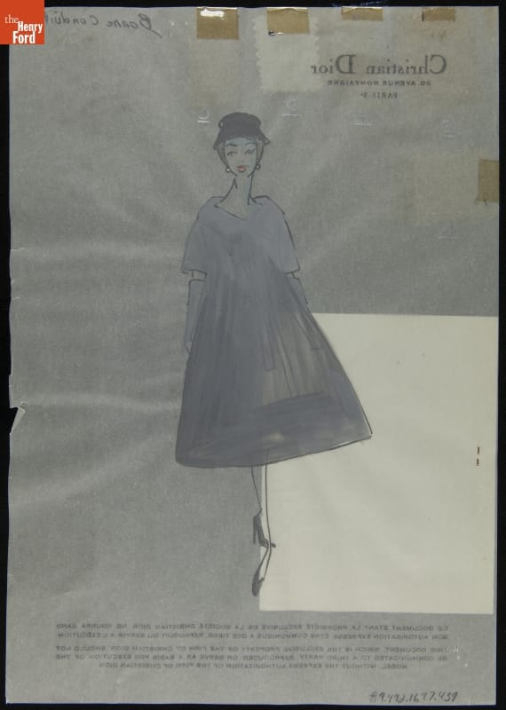 Fashion houses provided sketches to clients interested in purchasing garments from the designer's line of couture clothing. These sketches contained an image of a gown, dress or other apparel, illustrating the designer's stylistic vision. Fabric samples were usually included. Clients could then decide which design to purchase and suggest personal changes. This sketch was sent to Elizabeth Parke Firestone, wife of tire magnate Harvey S. Firestone, Jr.