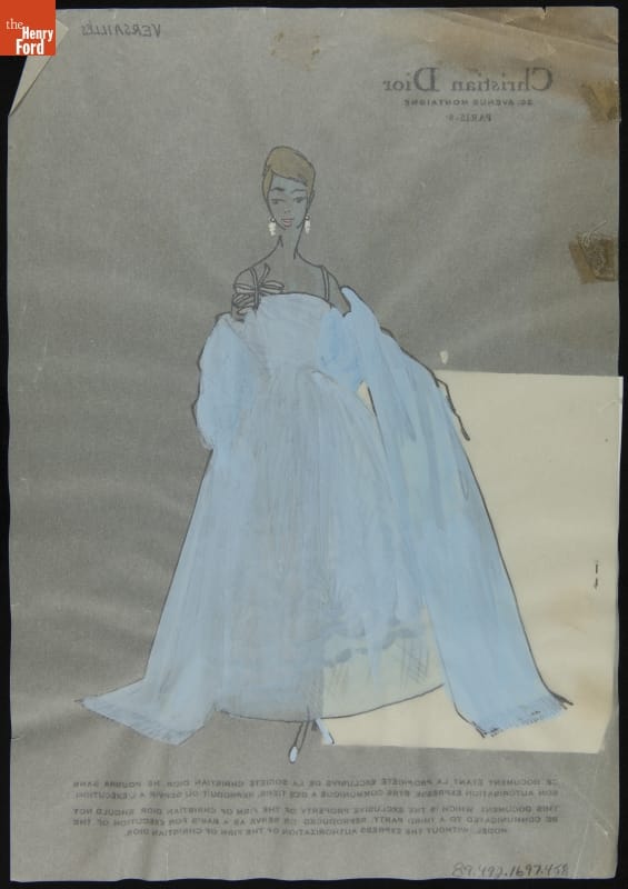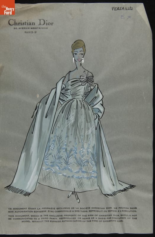 Fashion houses provided sketches to clients interested in purchasing garments from the designer's line of couture clothing. These sketches contained an image of a gown, dress or other apparel, illustrating the designer's stylistic vision. Fabric samples were usually included. Clients could then decide which design to purchase and suggest personal changes. This sketch was sent to Elizabeth Parke Firestone, wife of tire magnate Harvey S. Firestone, Jr.