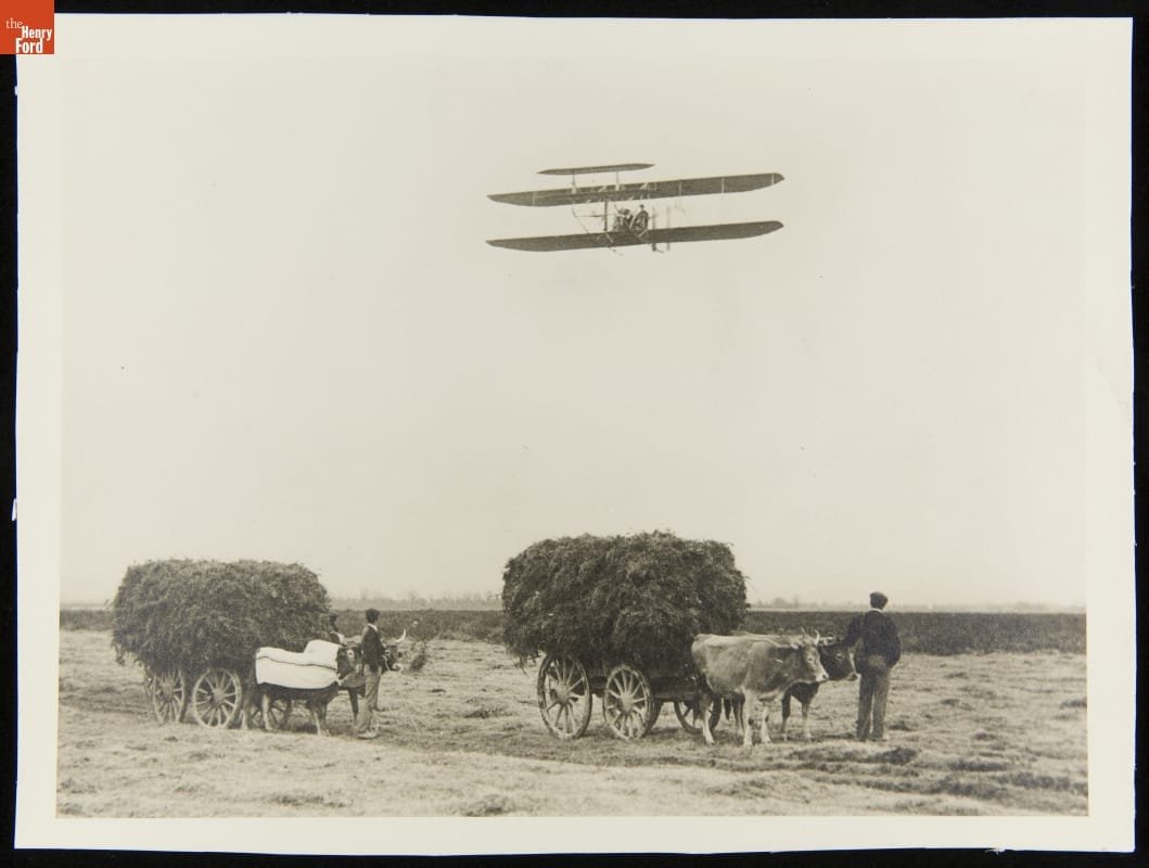 Wilbur Wright Flying over a Farm, Pau, France, 1909