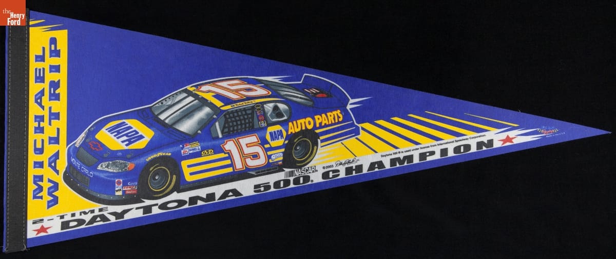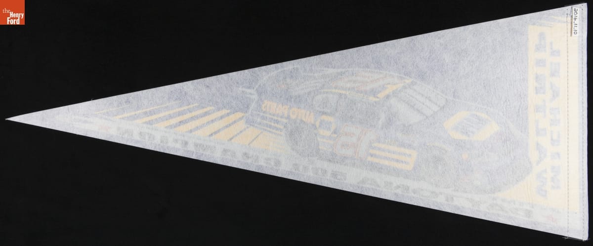 Many NASCAR fans buy souvenirs to show their support of individual drivers. Devoted followers can choose from an array of branded memorabilia--clothing, flags, decals, die cast models and other mementos. In the late 1990s and early 2000s, racing enthusiasts could purchase an inexpensive pennant like this one to wave in the stands or to decorate the walls of their homes.