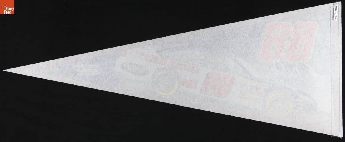 Many NASCAR fans buy souvenirs to show their support of individual drivers. Devoted followers can choose from an array of branded memorabilia--clothing, flags, decals, die cast models and other mementos. In the late 1990s and early 2000s, racing enthusiasts could purchase an inexpensive pennant like this one to wave in the stands or to decorate the walls of their homes.