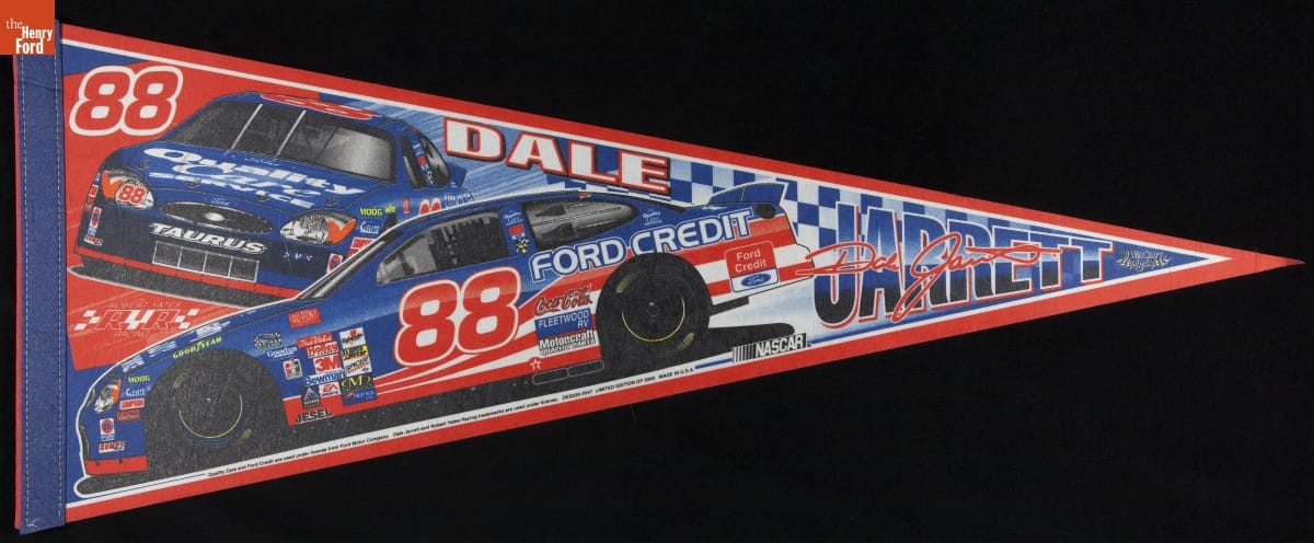 Many NASCAR fans buy souvenirs to show their support of individual drivers. Devoted followers can choose from an array of branded memorabilia--clothing, flags, decals, die cast models and other mementos. In the late 1990s and early 2000s, racing enthusiasts could purchase an inexpensive pennant like this one to wave in the stands or to decorate the walls of their homes.