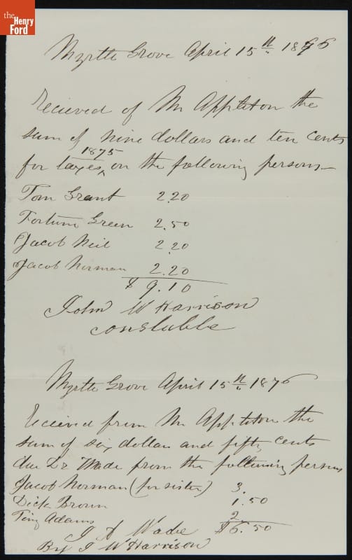 Receipt of Taxes Paid by George L. Appleton April 15, 1876