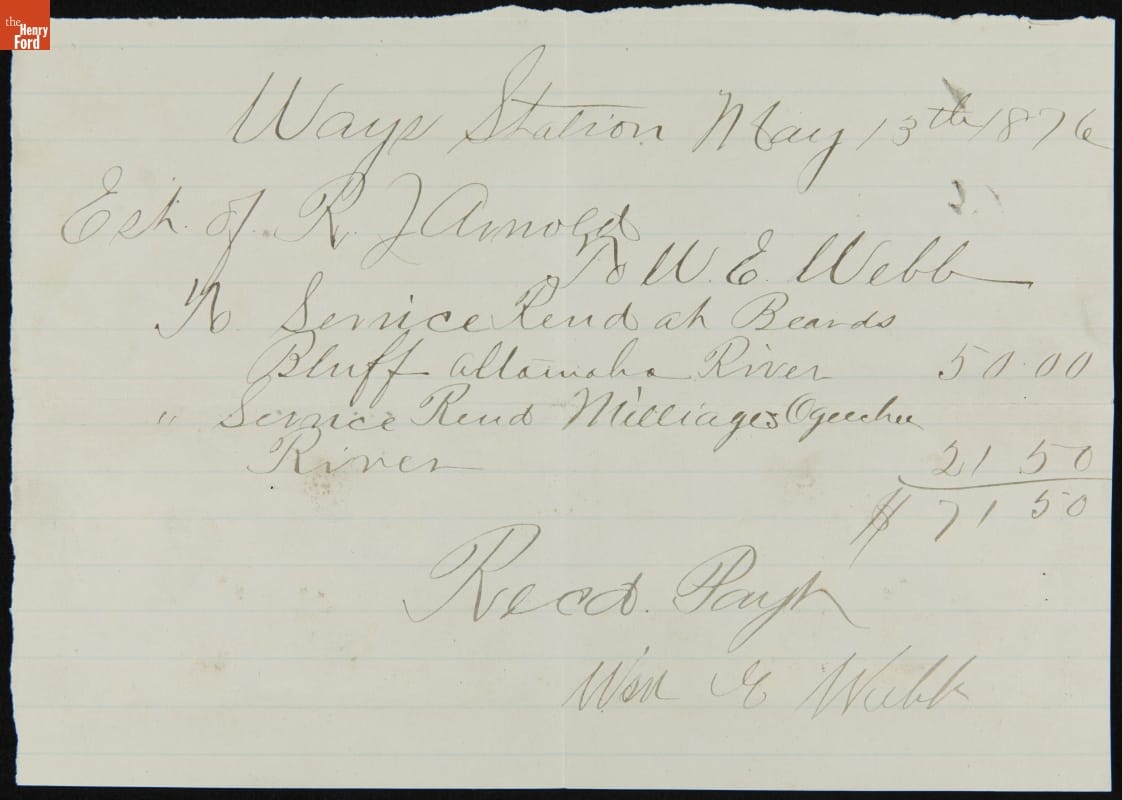 "Ways Station May 13th 1876 / Est of R. J. Arnold / To W. G. Webb / To service Rend at Beards Bluff Altainaha River 50.00 / " Service Rend Milliages Ogeechee / River 21 50 / $71 50 / Recd Payt / Wsn G Webb"