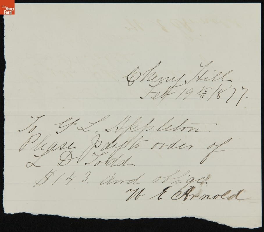Pay to Order Request from William E. Arnold to George Appleton, February 19, 1877