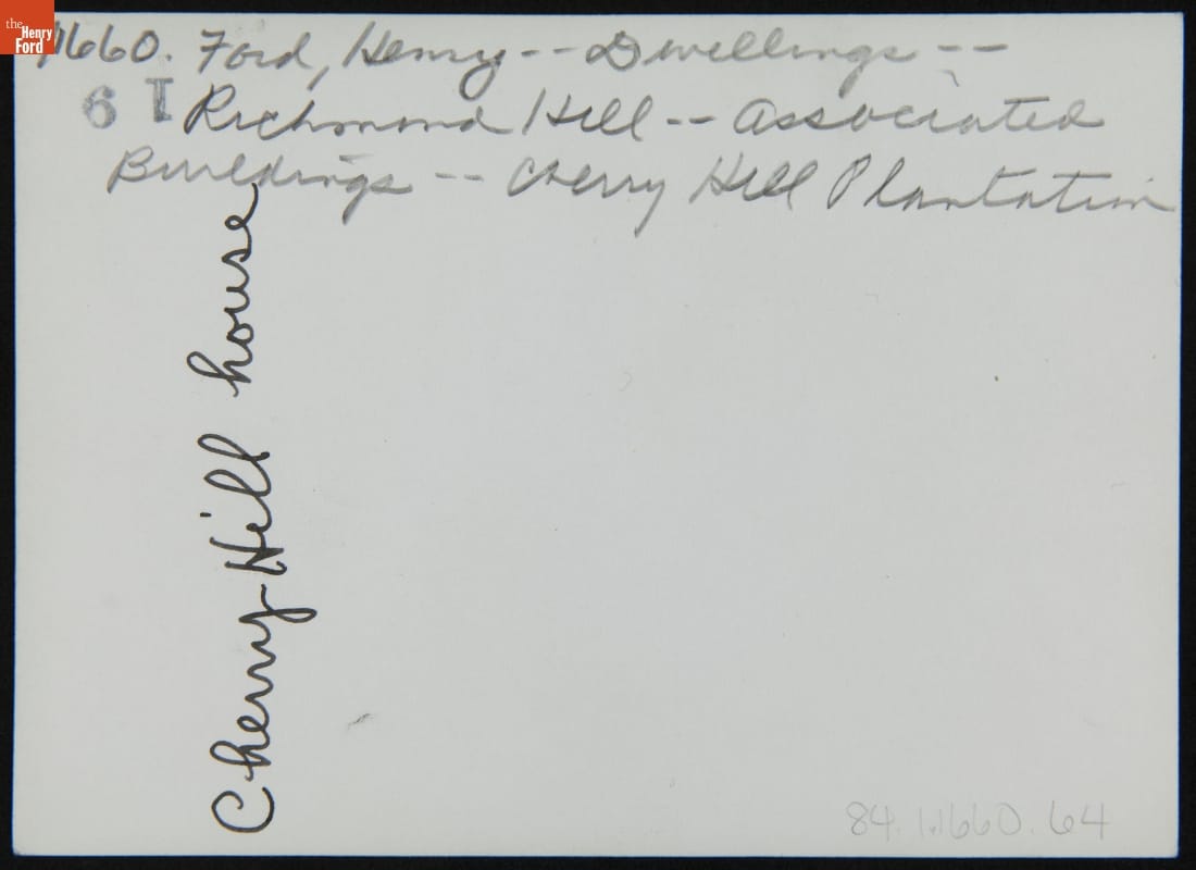 The Cherry Hill plantation house, located in present-day Bryan County, Georgia, was built in 1874 after the original building was burned during the Civil War. In the mid-1920s, Henry Ford began purchasing vast amounts of land in the area; he acquired Cherry Hill in 1925. Henry and Clara stayed in this house before the completion of their nearby winter residence, Richmond Hill.