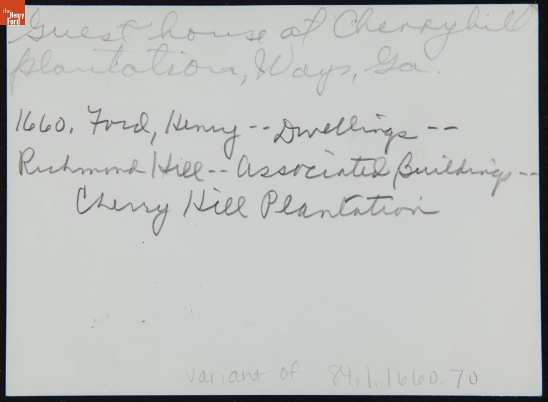 Henry Ford purchased vast amounts of land around present-day Richmond Hill, Georgia, beginning in the 1920s. In 1925, Henry Ford purchased the Cherry Hill plantation. Henry and Clara stayed in the plantation house before the completion of their nearby winter residence. Ford renovated the adjacent service building putting in an office and living spaces for his personal secretary and the chauffeurs.