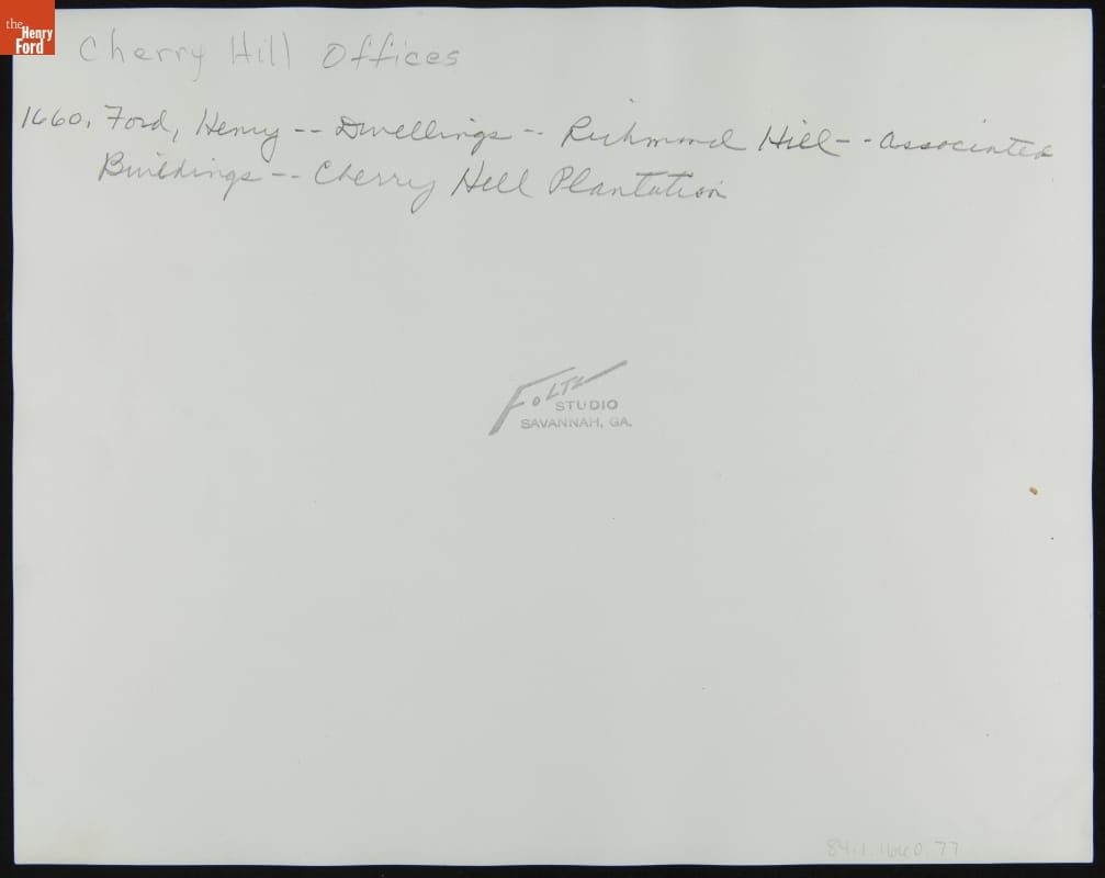 Henry Ford purchased vast amounts of land around present-day Richmond Hill, Georgia, beginning in the 1920s. In 1925, Henry Ford purchased the Cherry Hill plantation. Henry and Clara stayed in the plantation house before the completion of their nearby winter residence. Ford renovated the adjacent service building putting in an office and living spaces for his personal secretary and the chauffeurs.