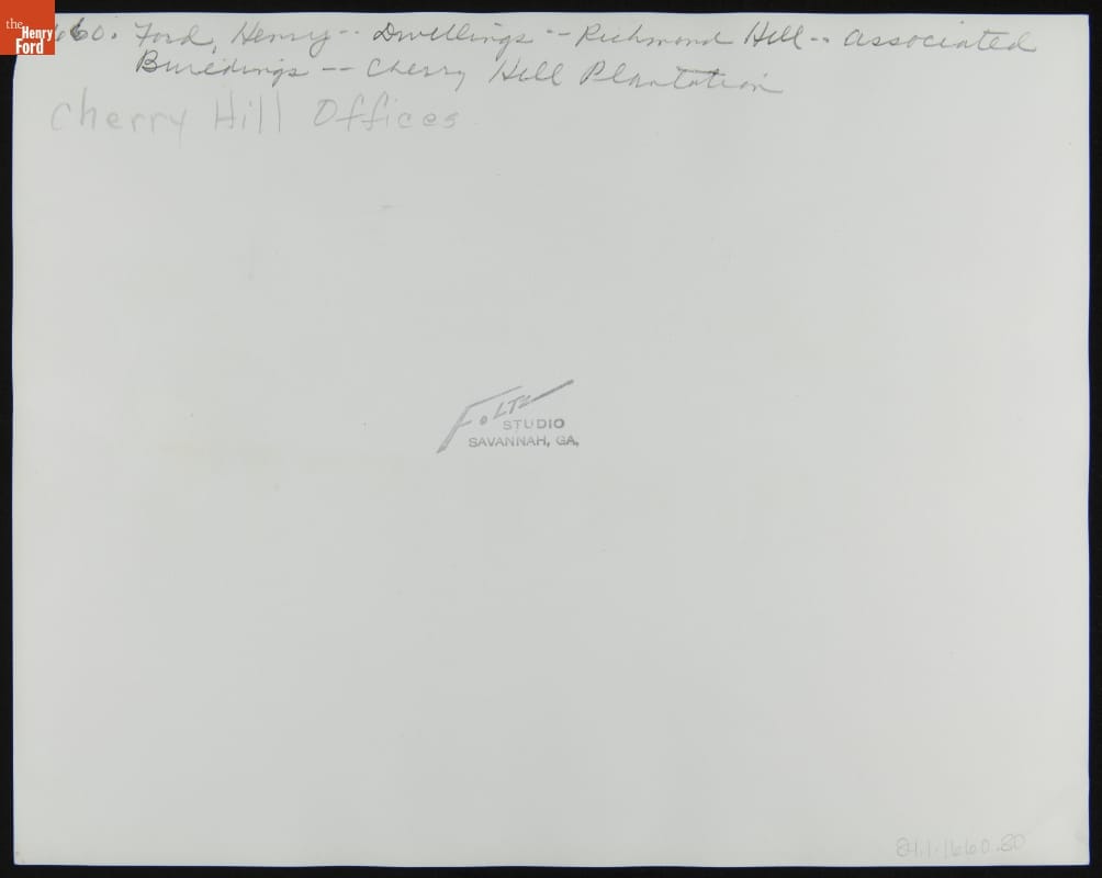 Henry Ford purchased vast amounts of land around present-day Richmond Hill, Georgia, beginning in the 1920s. In 1925, Henry Ford purchased the Cherry Hill plantation. Henry and Clara stayed in the plantation house before the completion of their nearby winter residence. Ford renovated the adjacent service building putting in an office and living spaces for his personal secretary and the chauffeurs.