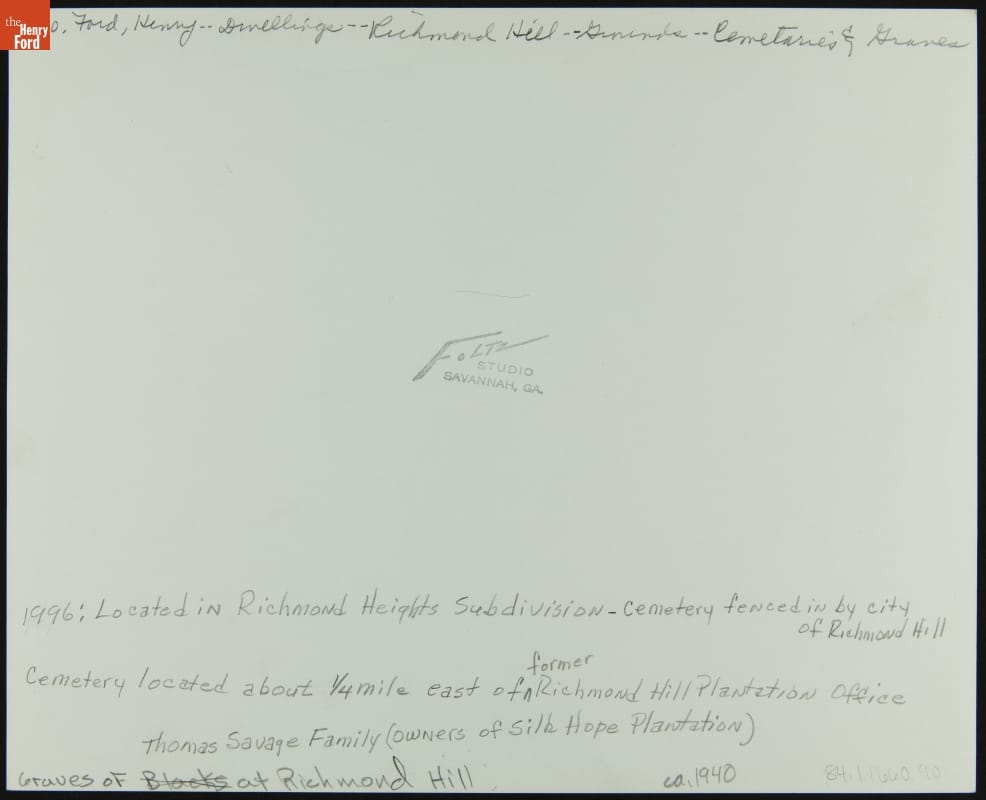 Henry Ford purchased vast amounts of land around present-day Richmond Hill, Georgia, beginning in the 1920s. Ford eventually acquired 85,000 acres -- and even built a winter residence. Located in the area is this historic cemetery. A pre-Civil War Presbyterian Church that served the local plantation community stood nearby, but it burned in 1882. The unfortunate event gave the cemetery its name.