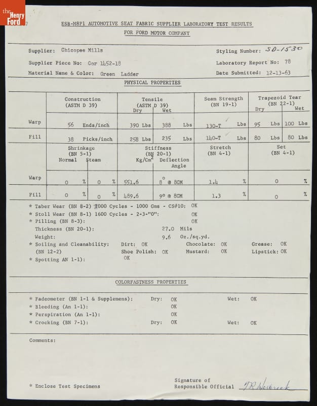 Test Report, Green Ladder Woven Plastic Fabric, December 13, 1963
