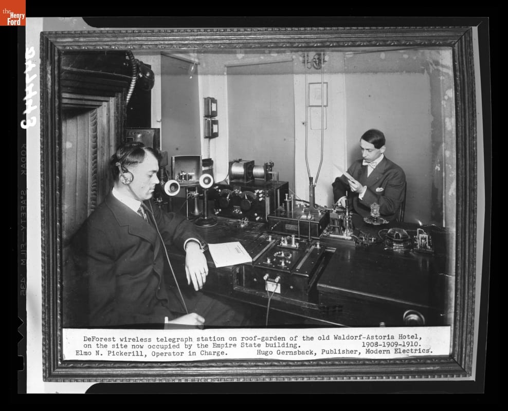 This image depicts Hugo Gernsback and station manager Elmo Pickerill inside the United Wireless radio station atop the Waldorf-Astoria hotel in New York City (Station "WA"). Gernsback was the publisher of the first science fiction and radio electronics magazines. In 1925, he founded his own AM radio station, WRNY. Pickerill became Chief Radio Officer aboard the SS Leviathan in 1923.