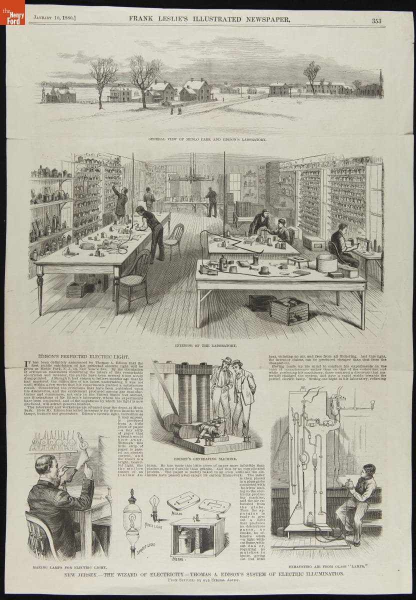 GENERAL VIEW OF MENLO PARK AND EDISON'S LABORATORY. / INTERIOR OF THE LABORATORY / EDISON'S GENERATING MACHINE / MAKING LAMPS FOR ELECTRIC LIGHT / EXHAUSTING AIR FROM GLASS "LAMPS" / NEW JERSEY - THE WIZARD OF ELECTRICITY--THOMAS A. EDISON'S SYSTEM OF ELECTRIC ILLUMINATION / FROM SKETCHES BY OUR SPECIAL ARTIST.