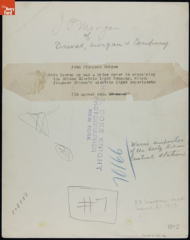 J.P. Morgan was the most influential banker and financier in the United States during the late 19th and early 20th centuries. He held financial interests in railroads, steel mills and manufacturers, and he amassed a personal fortune of $80 million. Morgan supported Thomas Edison's early electric experiments and played a key role in the formation of General Electric.