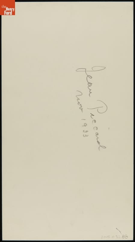 The Piccard stratosphere flight departed Ford Airport October 23, 1934. Spouses Jean and Jeannette Piccard ascended 10.9 miles in a magnesium gondola carried by a hydrogen balloon. The Piccards were guests of Henry Ford at the Dearborn Inn while Jeannette trained for flight. This image depicts Jean standing in the Menlo Park Laboratory at Greenfield Village.