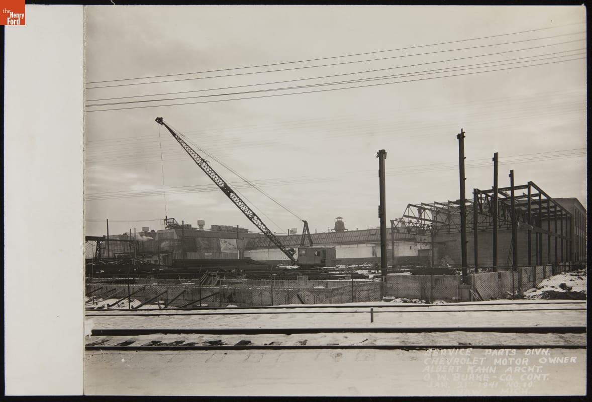 Construction is underway at Chevrolet's Service Parts Division plant in Saginaw, Michigan, in this 1941 photo. This new building was designed by Albert Kahn, among the most influential industrial architects of the early 20th century. Kahn's airy reinforced concrete structures were popular with automakers. He also counted Packard, Ford, Hudson, and Dodge Brothers among his clients.