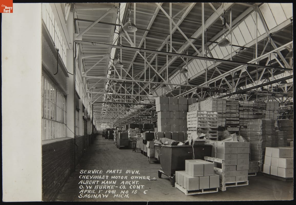 Construction is underway at Chevrolet's Service Parts Division plant in Saginaw, Michigan, in this 1941 photo. This new building was designed by Albert Kahn, among the most influential industrial architects of the early 20th century. Kahn's airy reinforced concrete structures were popular with automakers. He also counted Packard, Ford, Hudson, and Dodge Brothers among his clients.