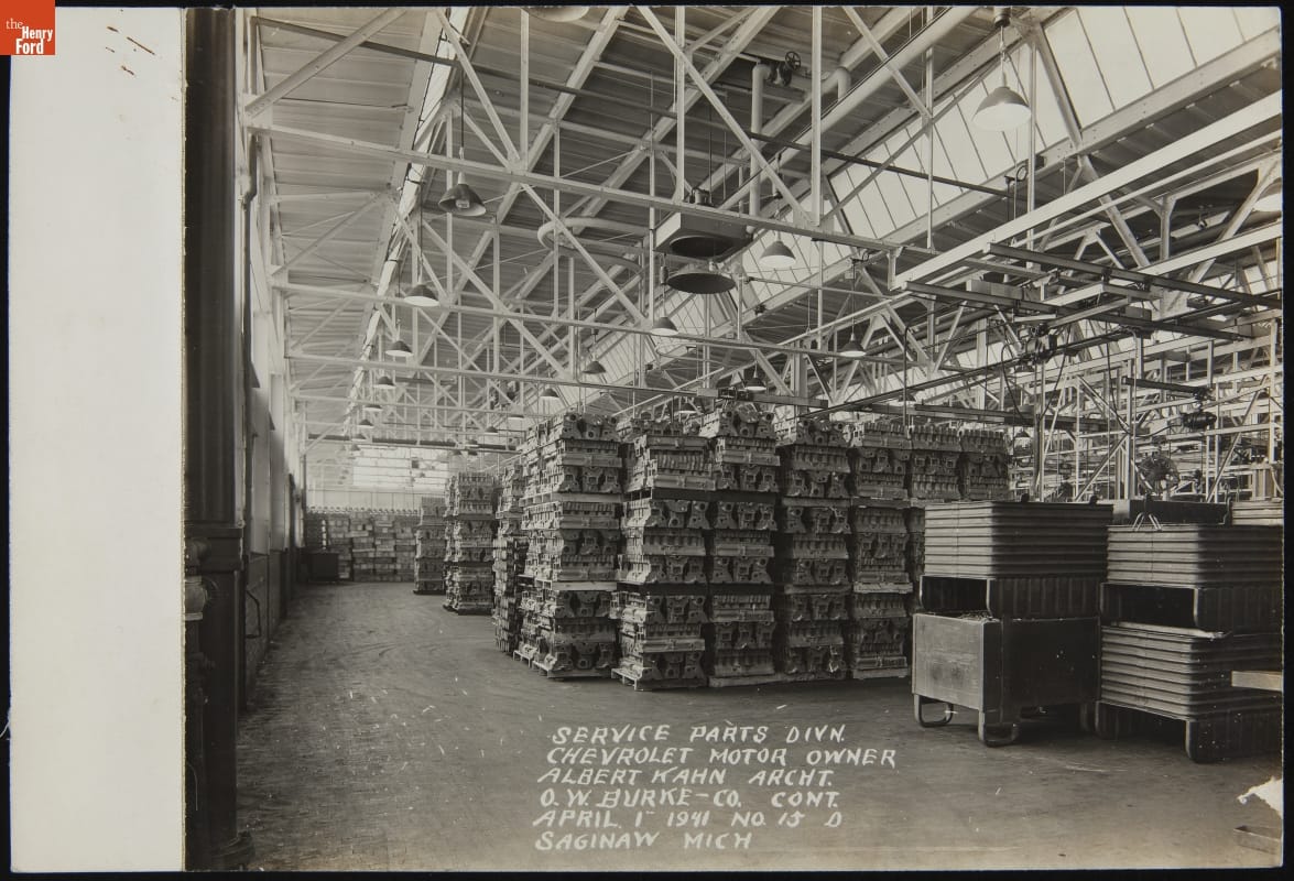 Construction is underway at Chevrolet's Service Parts Division plant in Saginaw, Michigan, in this 1941 photo. This new building was designed by Albert Kahn, among the most influential industrial architects of the early 20th century. Kahn's airy reinforced concrete structures were popular with automakers. He also counted Packard, Ford, Hudson, and Dodge Brothers among his clients.
