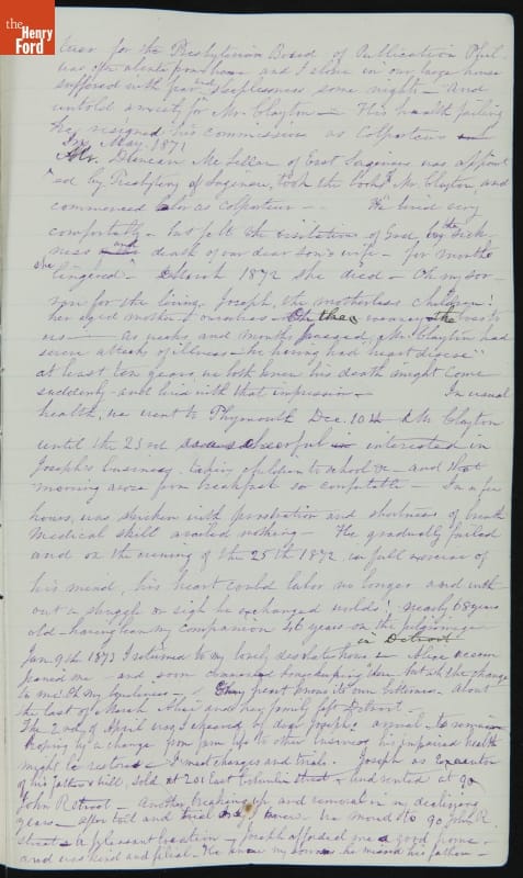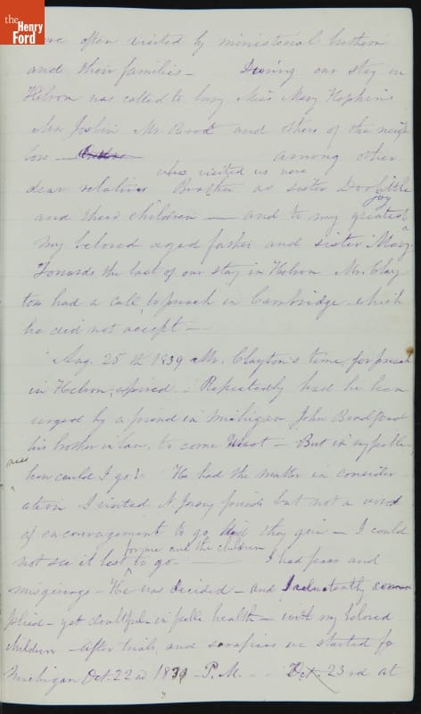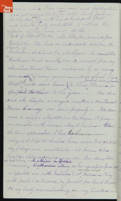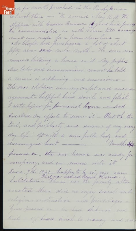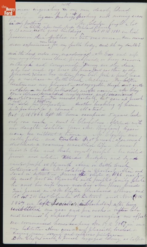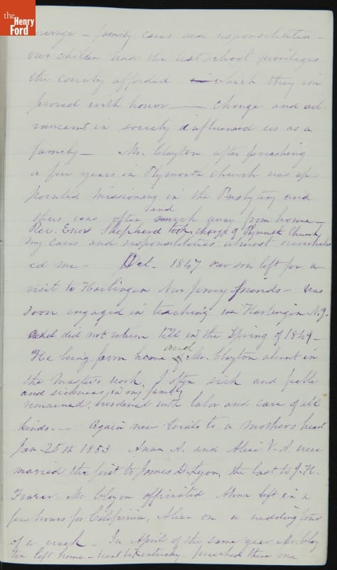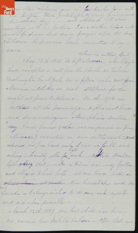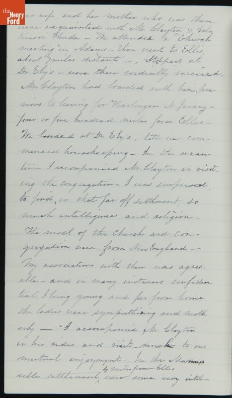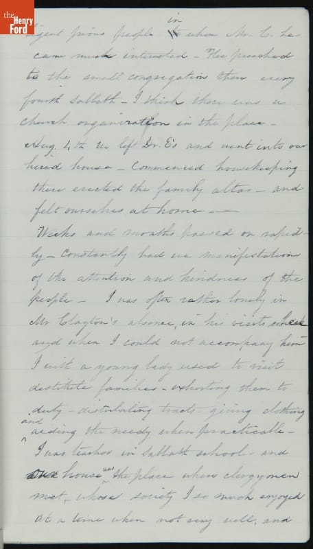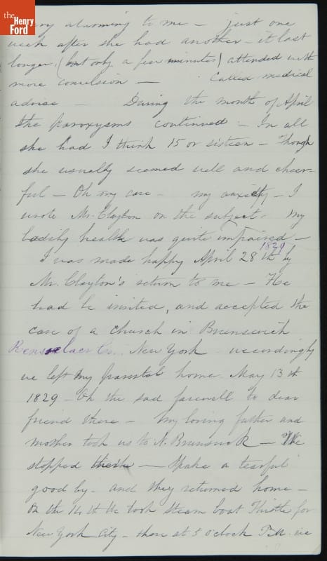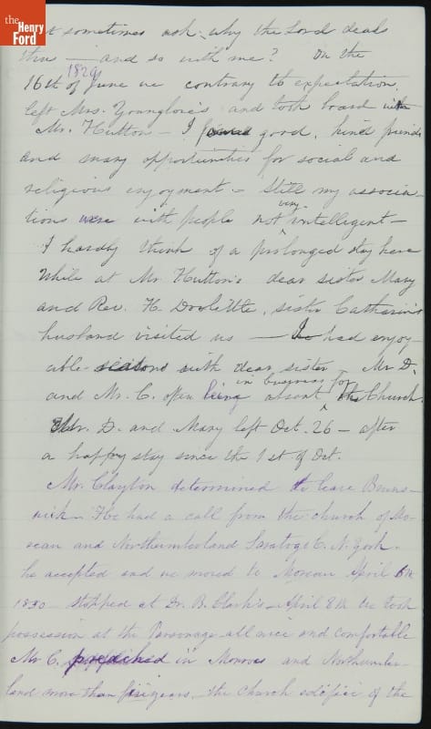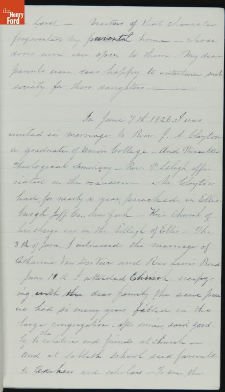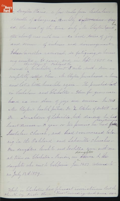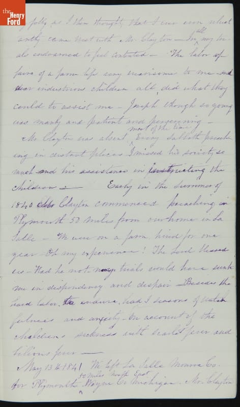 Margaret Skillman Clayton (1803-1894) recounts her life as a minister's wife in this 1883 hand-written autobiography. Margaret was born in New Jersey and became a school teacher before marrying Reverend Joshua Anderson Clayton in 1826. The couple had several children and moved often--Rev. Clayton served several churches in New York and later in Michigan. Margaret's personal narrative chronicles her family's journey in 19th-century America.